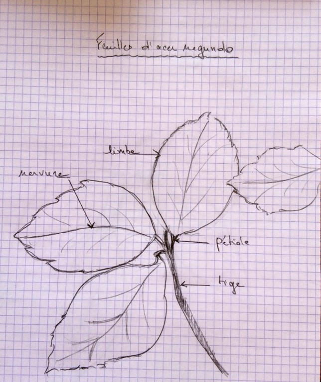 L'acer negundo : son feuillage est caduc, ses feuilles sont simples, opposées, le limbe est denté, la nervation est pennée. Chaque feuille porte un pétiole. Ces feuilles ressemblent aux feuilles de frêne et c'est pour cela que l'acer negundo est également appelé érable à feuilles de frênes.