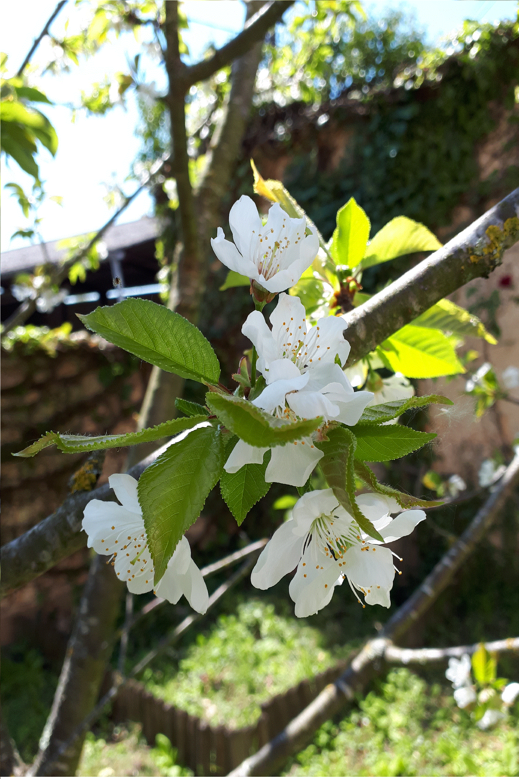 Mes annotations sur un Griottier (Prunus cerasus). Je n'étais pas sûre pour le type d'inflorescence mais il s'agit peut-être d'une inflorescence condensée (en ombelle) : il y a à chaque fois plusieurs fleurs qui partent du même point.