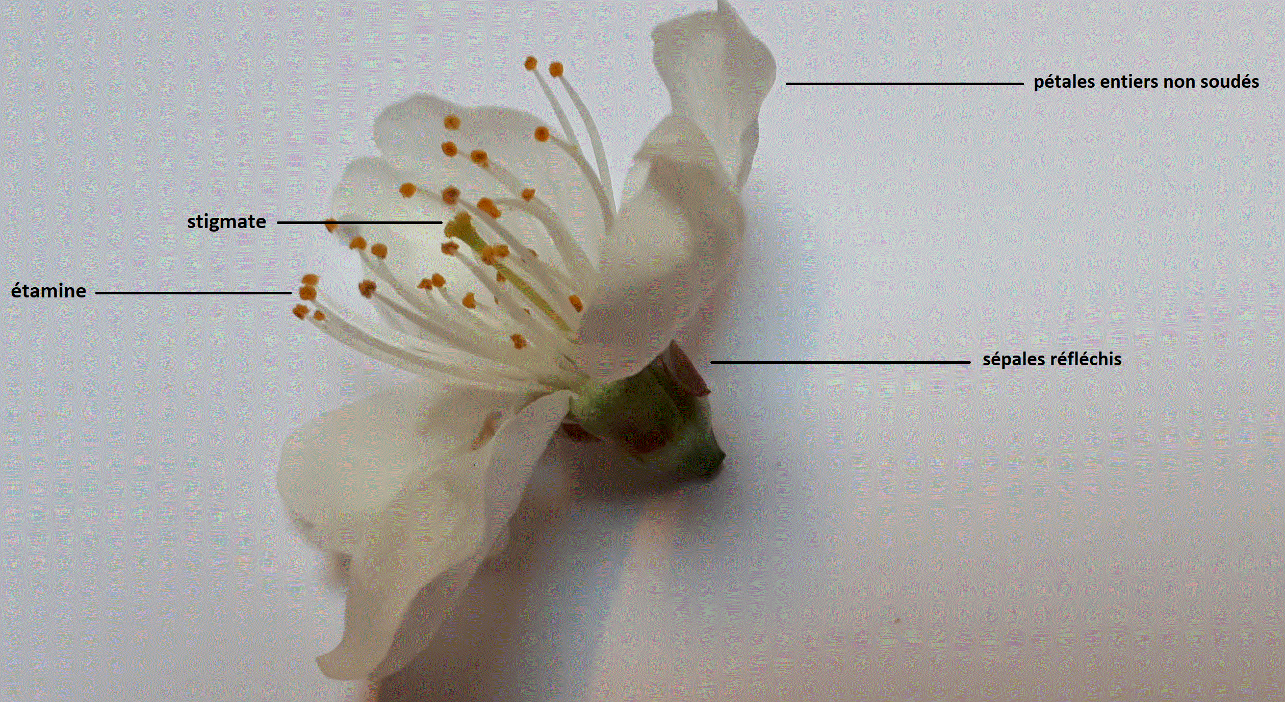 comme les fléches vous l'indiquent, les pétales sont blancs et separés, le pistil est jaune et sépale est bien visible