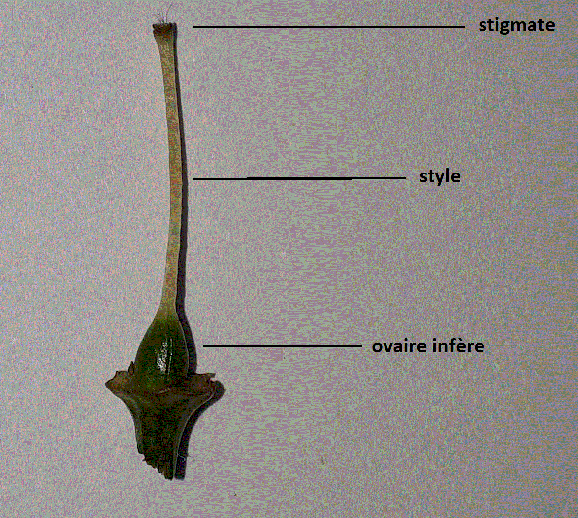 J'ai détaché une fleur et sur celle-ci se trouve donc un pistil je suppose, l'ovaire est supère. C'est une plante hermaphrodite. Elle a un périanthe différencié.
