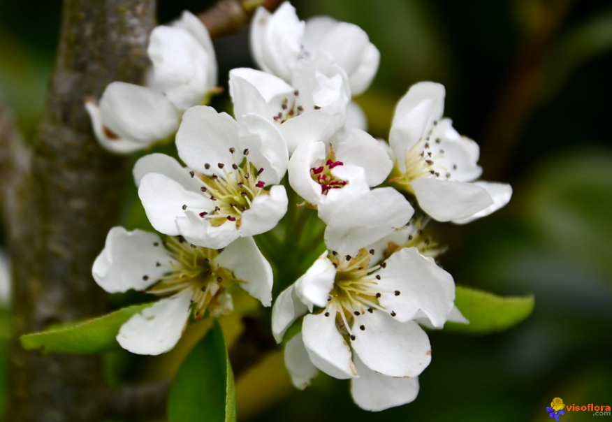 -Fleurs blanches présentant de légères stries à 5 pétales, plusieurs étamines, un pistil