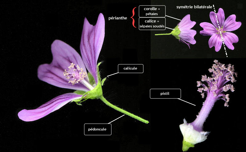 Au moment de légender la partie reproductive (androcée + gynécée) j'ai un gros doute. La photo en bas à gauche est une coupe longitudinale de la fleur, la photo en bas à droite est un "dépiautage" d'une fleur à un stade plus avancé. Que voit-on au sommet du pistil, étamines ou stigmates ? Il s'agit bien d'une fleur hermaphrodite, mais c'est un cas d'hermaphrodisme successif (ou séquentiel). Wikipedia article. Voir aussi cet article de recherche : Timing of Reproductive Organs Maturity in Proterandrous Malva sylvestris L.