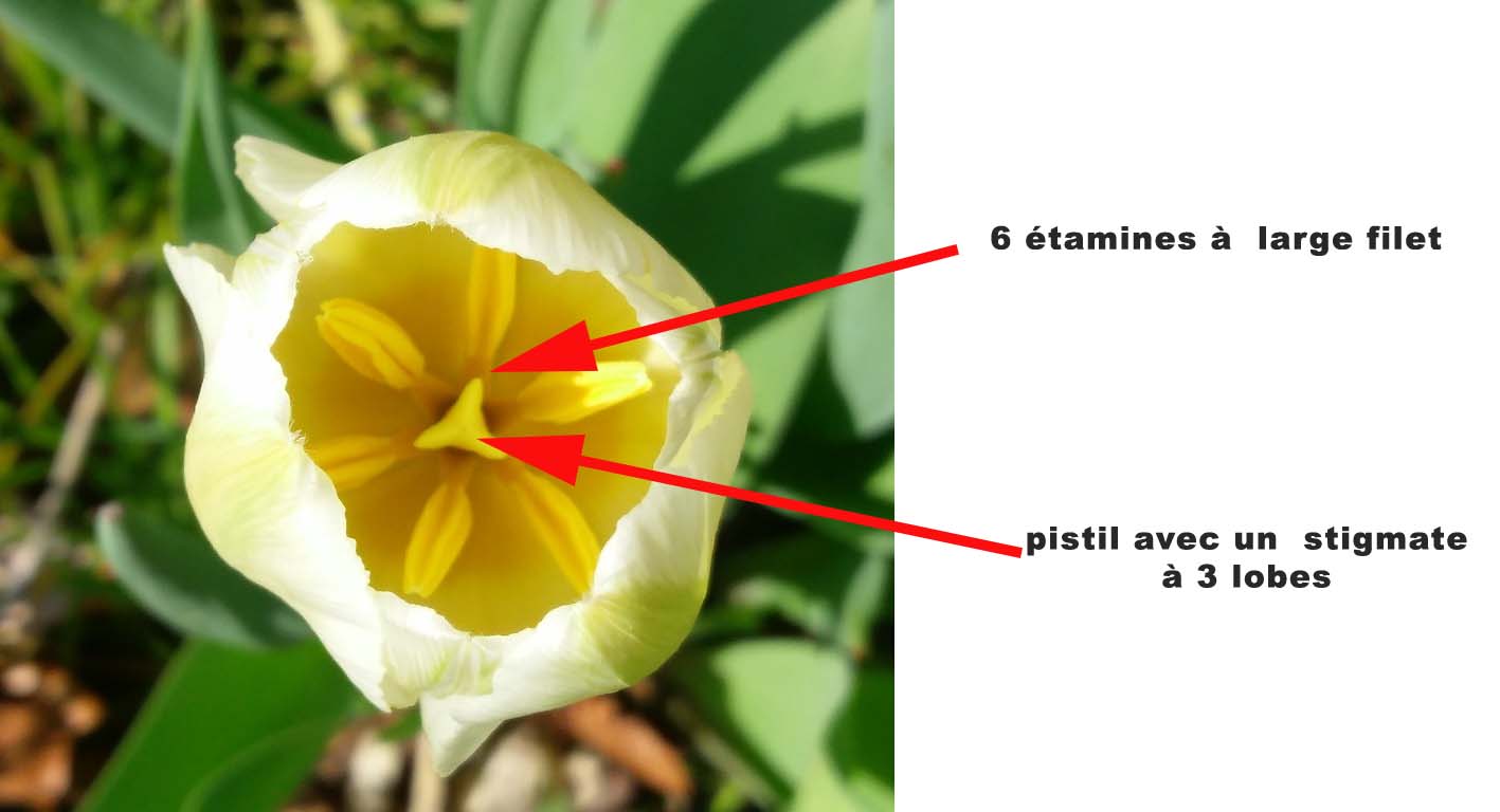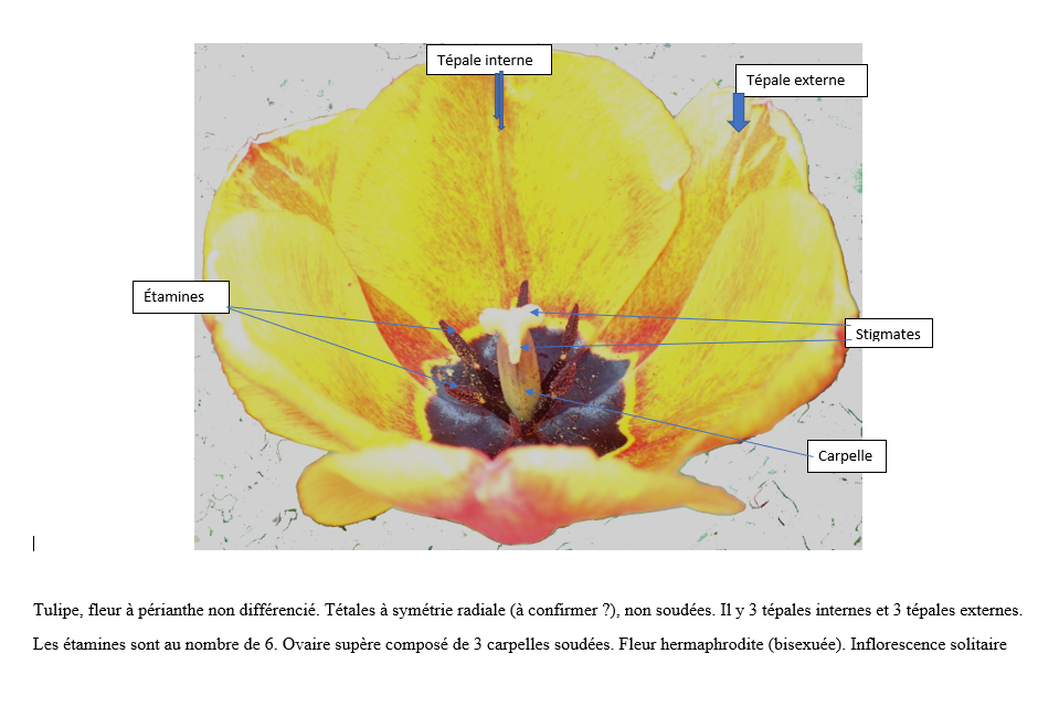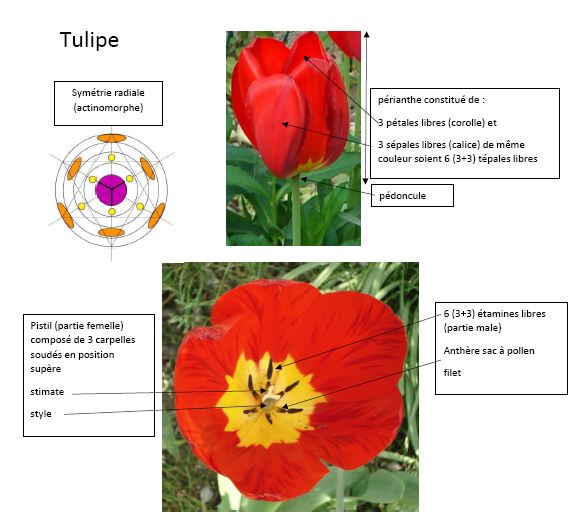 La tulipe, est une fleur bisexuée, de symétrie radiale. L'ovaire est supère et la carpelle soudée.
