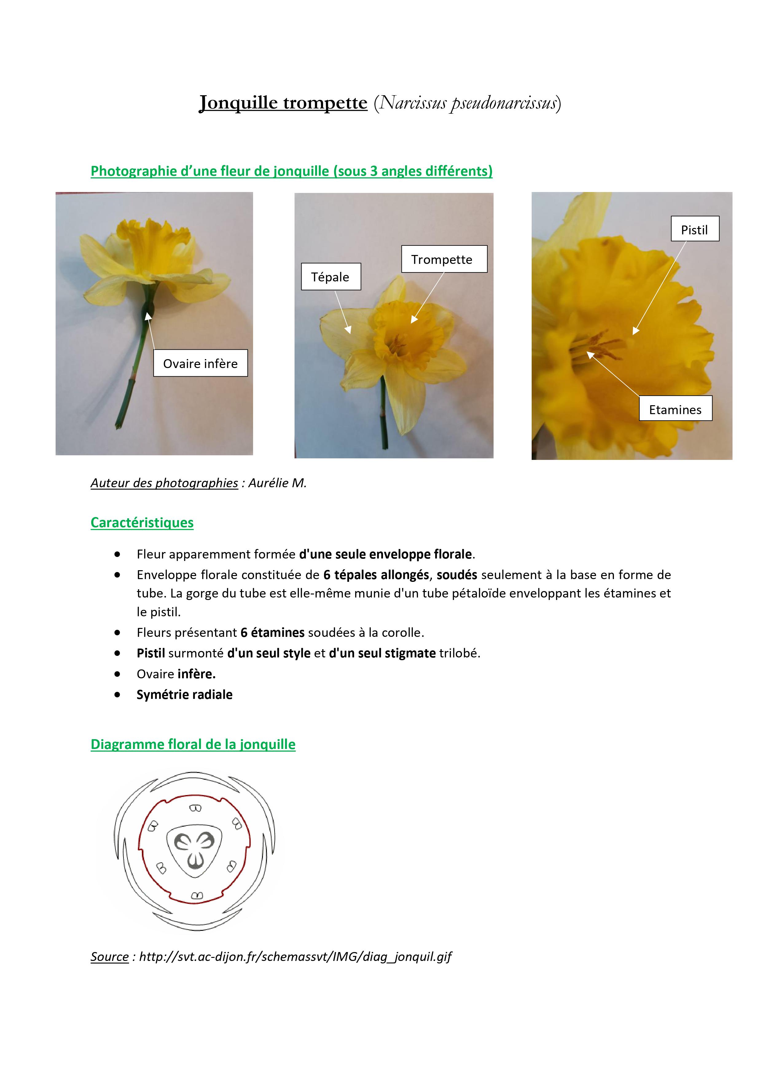 J'ai choisi la fleur de Jonquille trompette (Narcissus pseudonarcissus), car c'est une fleur que j'aime beaucoup, et qui est assez grande, ce qui permet d'observer aisément les différentes parties.