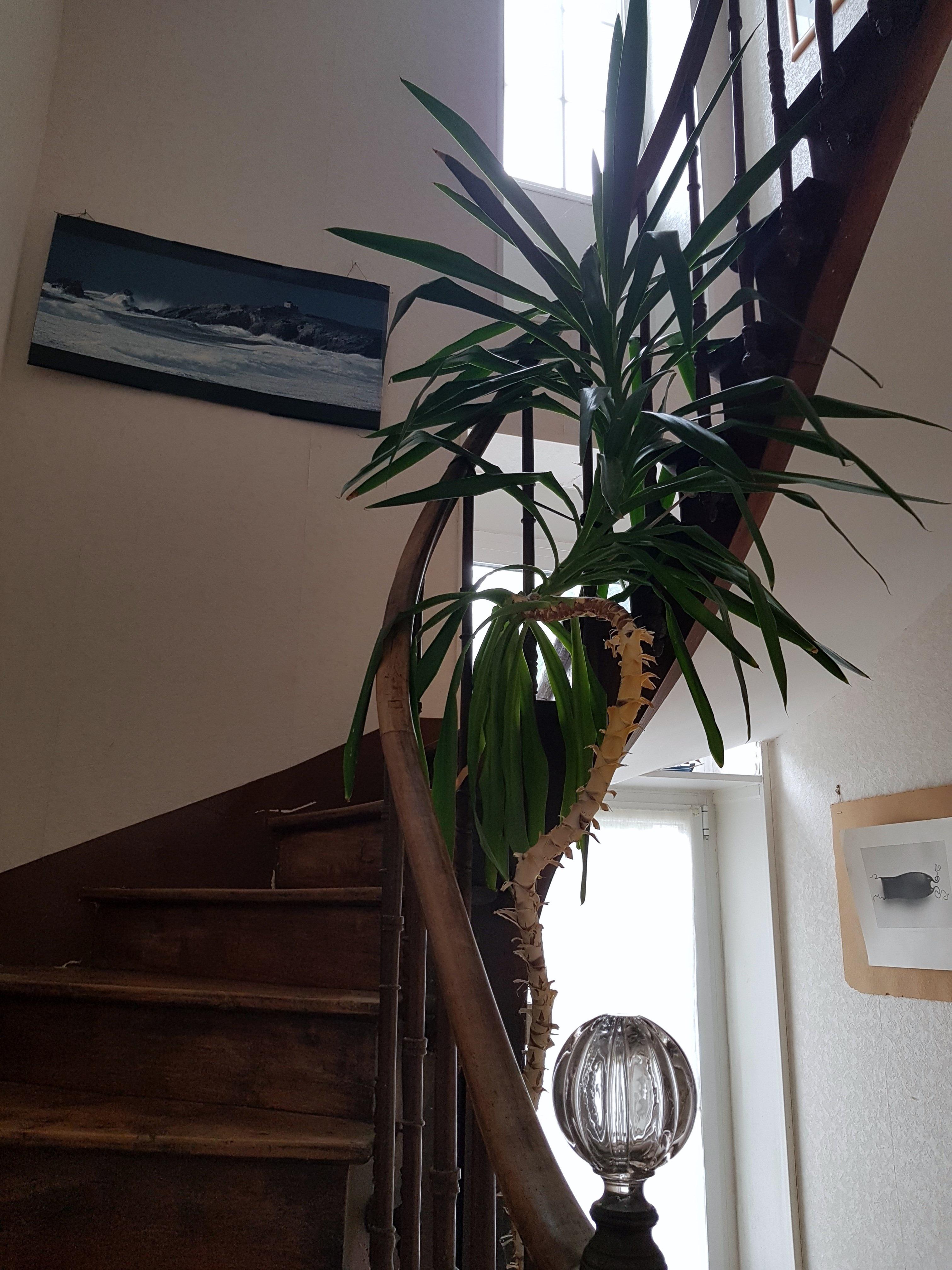 Après rempotage et tuteur, le yucca a repris sa pousse : il dépasse aujourd'hui les 2 mètres, ses feuilles (présentes uniquement sur le 1/3 de la partie haute) vont constamment rechercher la lumière.