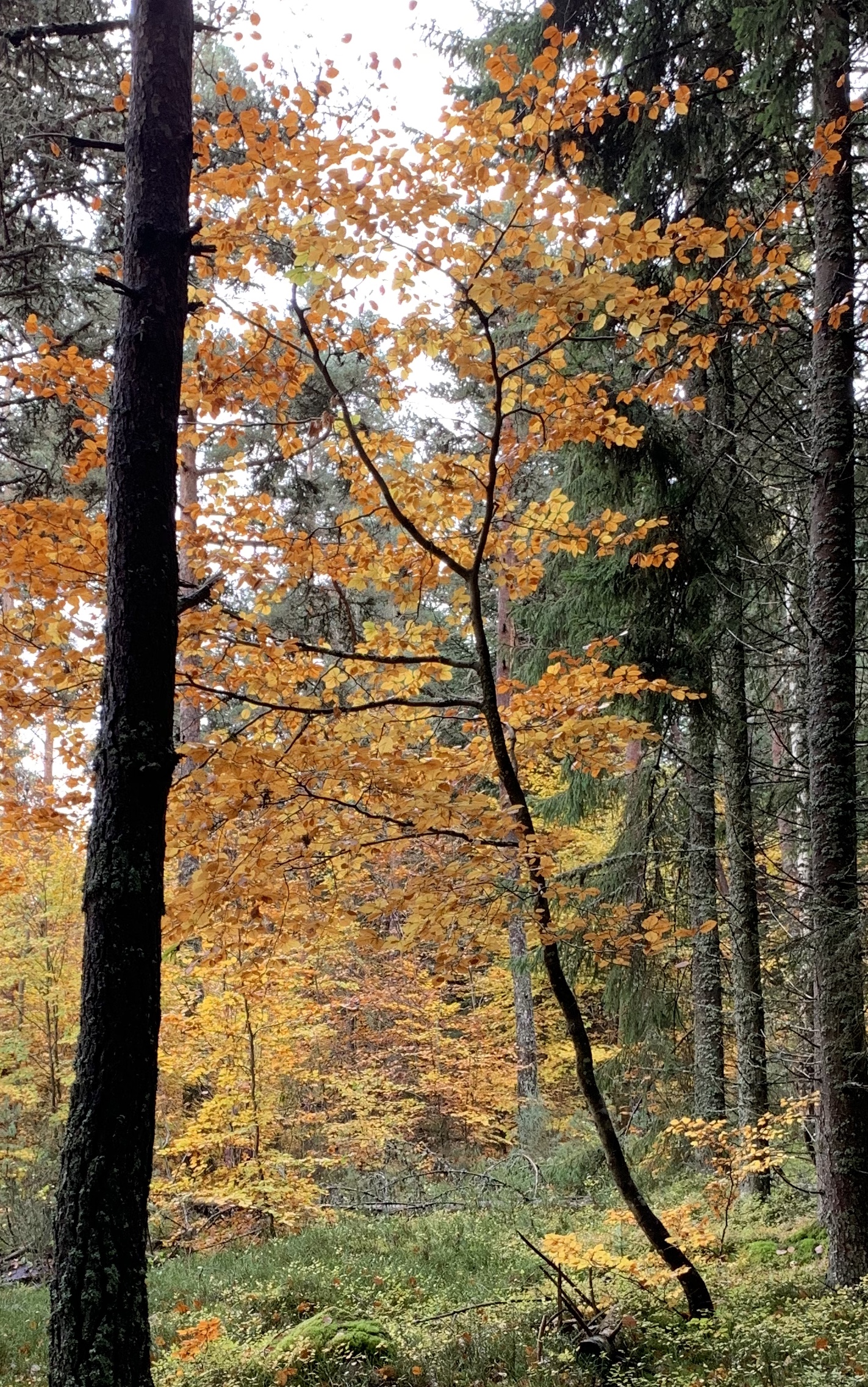 Voici une photo prise le 24/04/2020. Nous pouvons voir une lisière de forêt dans laquelle un épicéa (à gauche) et un charme (à droite) ont du se frayer un chemin pour rejoindre la canopée. Ils sont donc tous les deux "tordus" vers la même direction en quête de lumière.