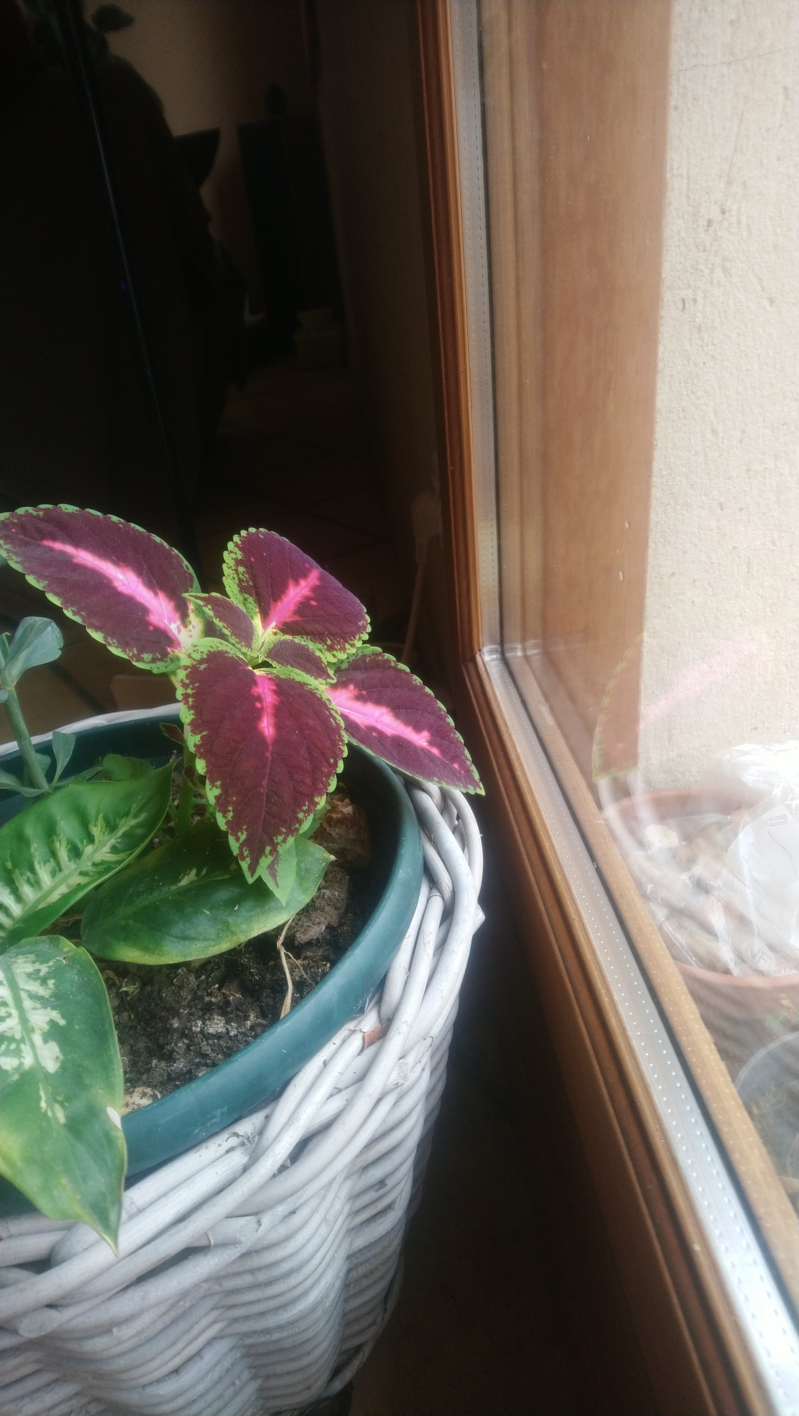 Le plectranthus fausse-scutellaire, Plectranthus scutellaroides, appartient à la famille des Lamiaceae et est originaire de Java en Indonésie. J'ai récupéré une bouture de cette plante chez une amie. On voit que celle-ci cherche à absorber le maximum de lumière en orientant toutes ses feuilles vers la source lumineuse. C'est une plante d'intérieur que j'ai mis devant ma baie vitrée. Je pense que la plante n'est peut-être pas très bien exposée par rapport à ses besoins, je l'ai pourtant positionné à l'endroit le plus lumineux en terme d'intensité et de quantité, mais les conditions climatiques du Finistère sont peut-être trop éloignées de celles de son pays d'origine. En plus de l'orientation des feuilles, je constate que ses couleurs sont moins "flashy" qu'elles devraient être du au manque de lumière.