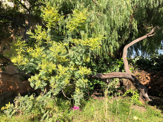 Ce mimosa dans mon jardin va chercher la lumière en contournant l'arbre dont les branches se sont étalées au-dessus de lui.