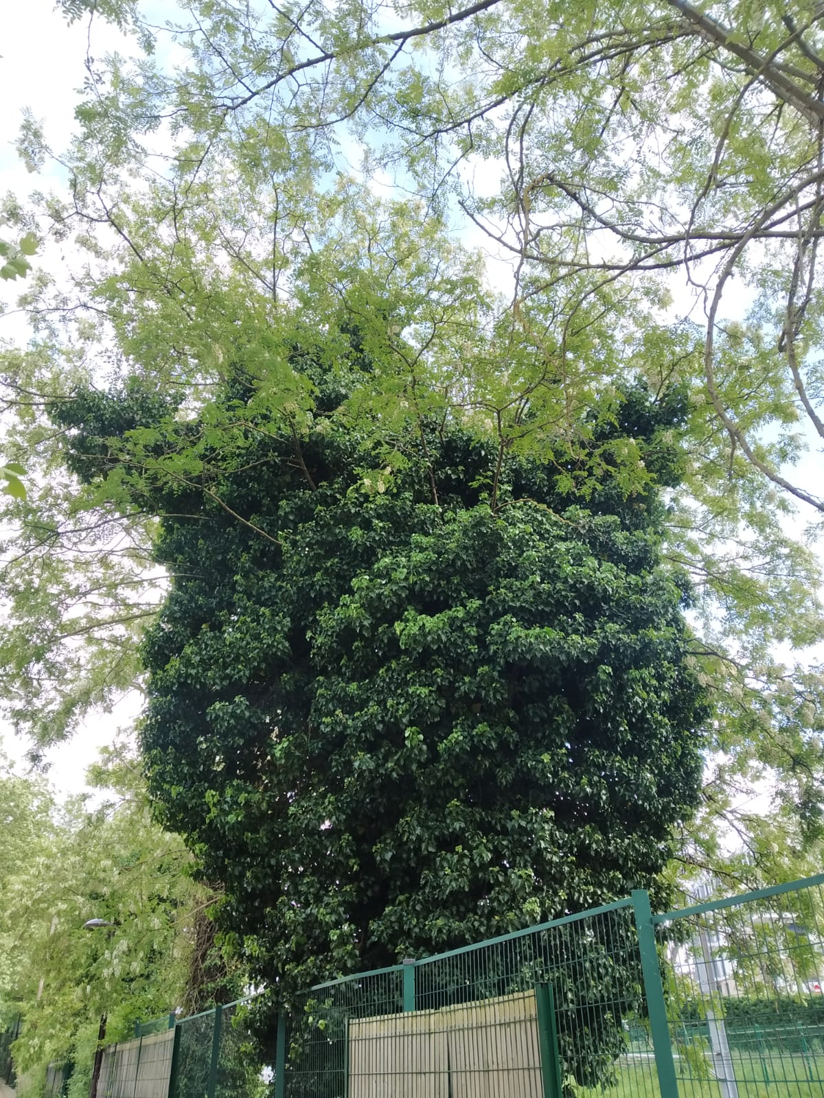 lierre étouffant complètement l'arbre initial sauf en haut où on voit ses branches
