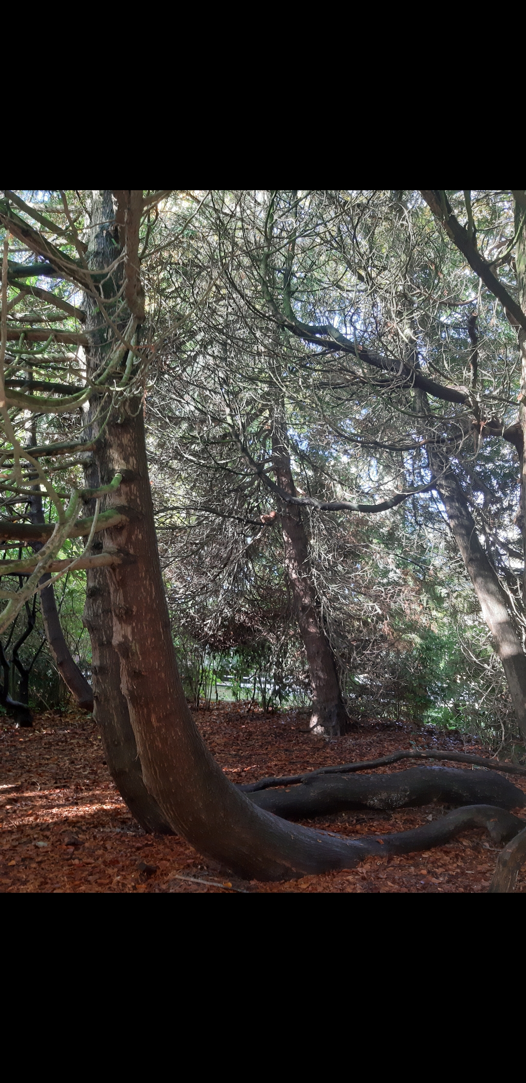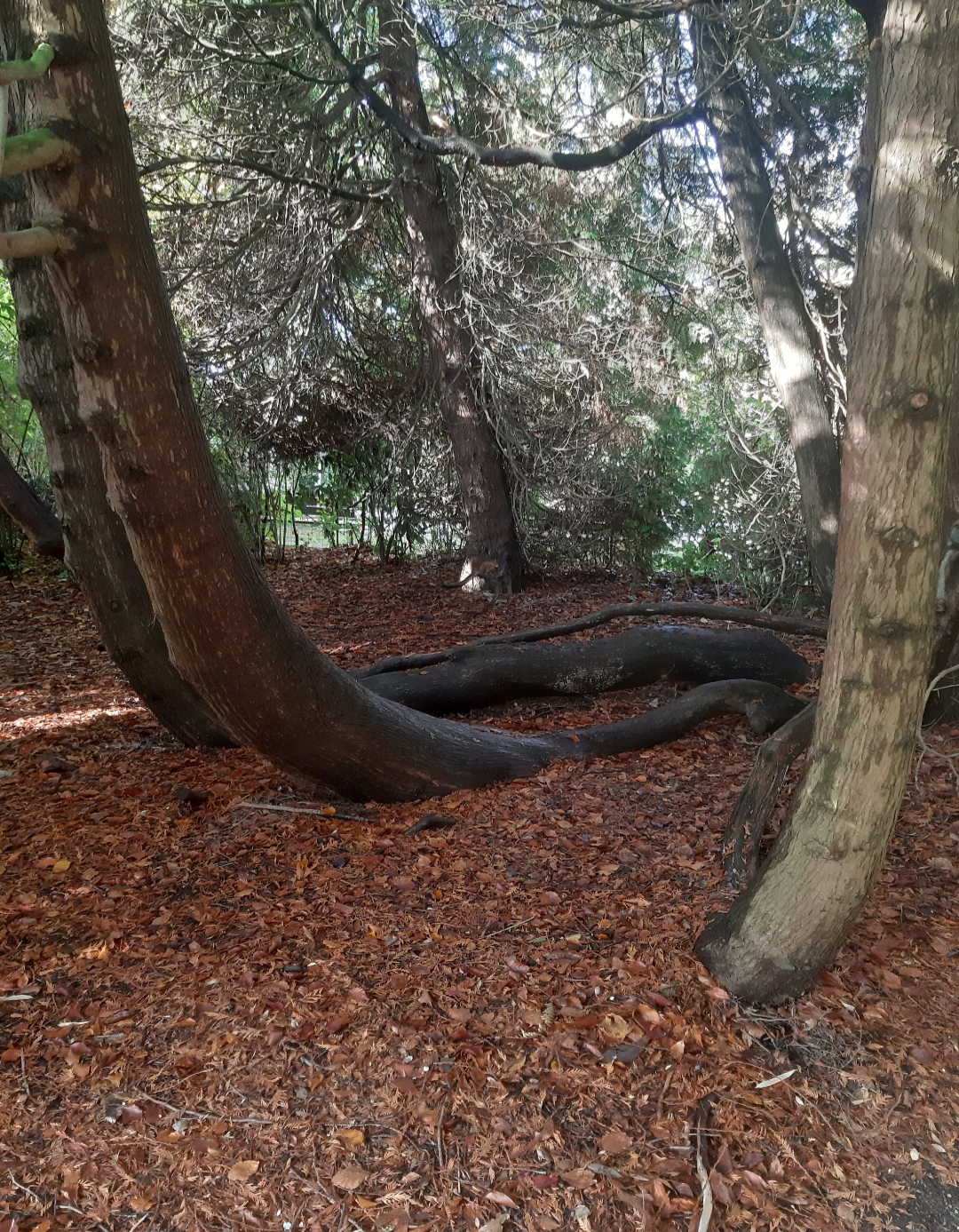 Les branches de l'arbre se frayent un chemin parmi ses propres branches, jusqu'à même fusionner le bois avec. Des contraintes physiques ont dû s'appliquer en début de croissance (?) d'où le tronc principal couché. Son apex a l'époque a dû être sectionné,et certains rameaux ont donc pris le relais à la verticale. Mais alors le pourquoi des branches horizontales..!