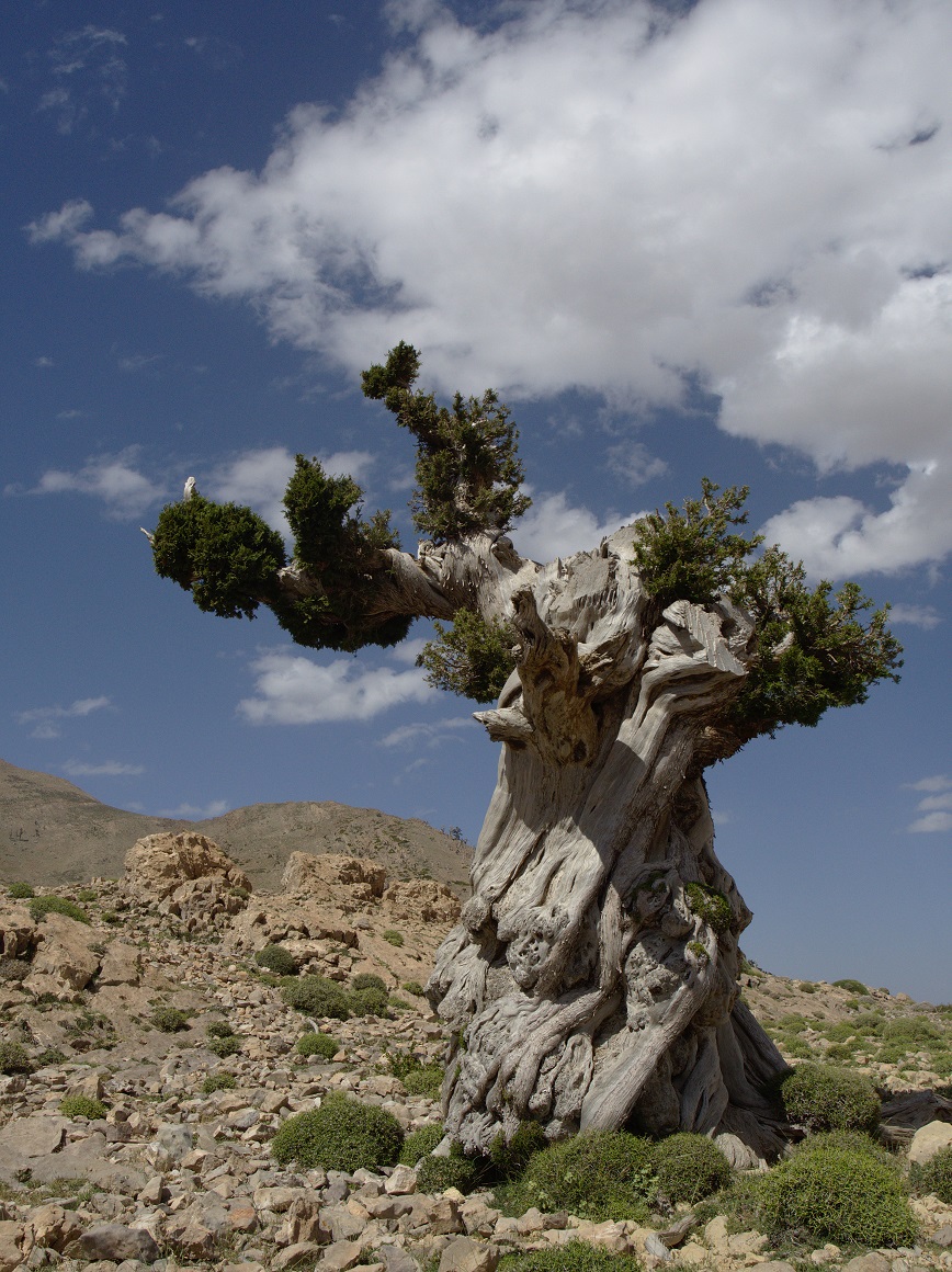 Arbre rencontré au Maroc au printemps dernier, un genévrier Juniperus sp. Je ne me rappel plus l'espèce, il y en a plusieurs ici. En montagne, dans une zone pâturée, vu la taille du tronc, l'arbre a du s'adapter à beaucoup de chose... Vent et neige avec un sommet étête, froid et chaleur avec des feuilles et rameaux très courts et ramassés, coup de hache avec beaucoup de cicatrice