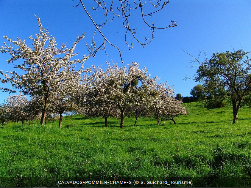 Le pommier a toujours eu une grande importance dans la culture locale. Arbre courant dans le bocage calvadosien, il faisait –et fait toujours- partie des haies mais trônait aussi dans les prés des vaches, silhouette familière chargée de petites pommes acidulées, les pommes à cidre qu’on « gaulait » à la fin de l’été. A une époque pas si lointaine où les bouilleurs de cru allaient de village en village, chaque ferme produisait son propre cidre et son calva à partir de ses pommes. Et qui ne connait pas le Trou Normand et le café-calva ?
