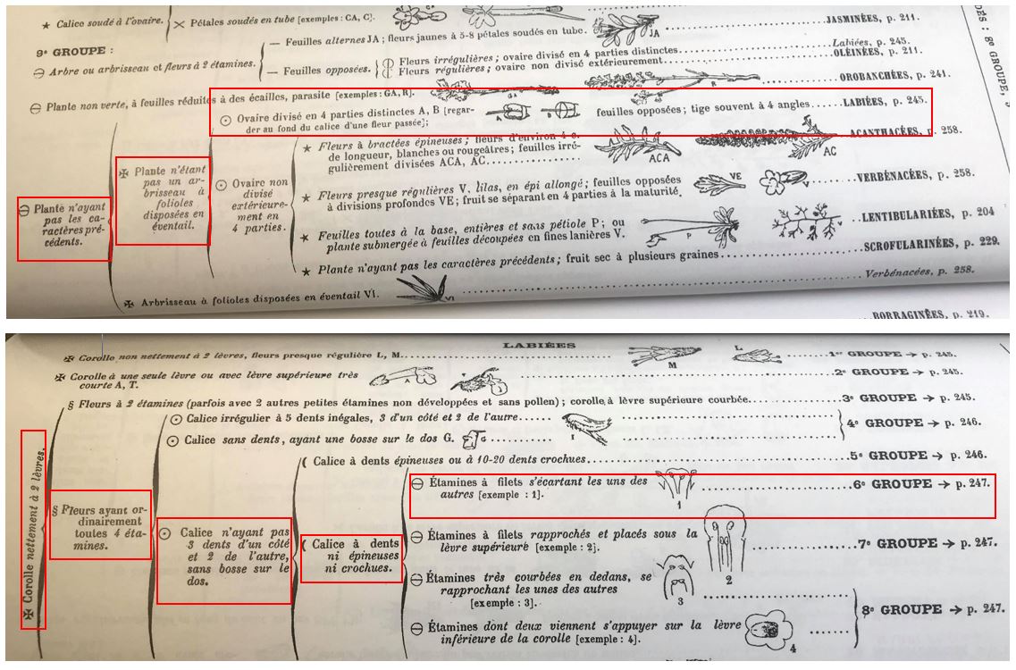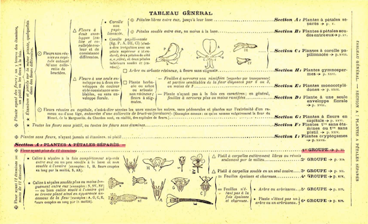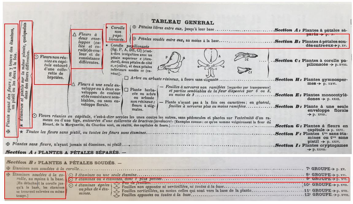 A partir du tableau général, on sélectionne la section A (fleurs non réunies en capitules, fleurs à deux enveloppes de couleurs et consistances différentes, corole non papillonaceae, pétales libres jusqu'à la base).