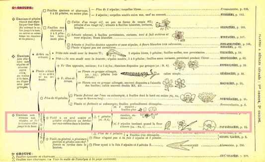 Aujourd'hui j'ai pris quelques photos d'une plante (pas la plus mystérieuse car sa fleur ressemblait fort à celle d'un coquelicot) puis utilisé la petite flore de Bonnier pour tenter de déterminer l'espèce. Je vous mets ci-dessous trois photos ainsi que le cheminement adopté à travers la dite flore. Je suis à peu près sûr de l'espèce (Papaver somniferum) mais il n'y a pas de taches noires à la base de la fleur. Je me dis que ce doit être le fait d'une sous-espèce. J'attends une éventuelle réponse sur Identiplante. Je suis en tout cas très content d'avoir pu manipuler la petite flore de Bonnier pour la première fois. C'est un système d'identification assez fascinant, je trouve.