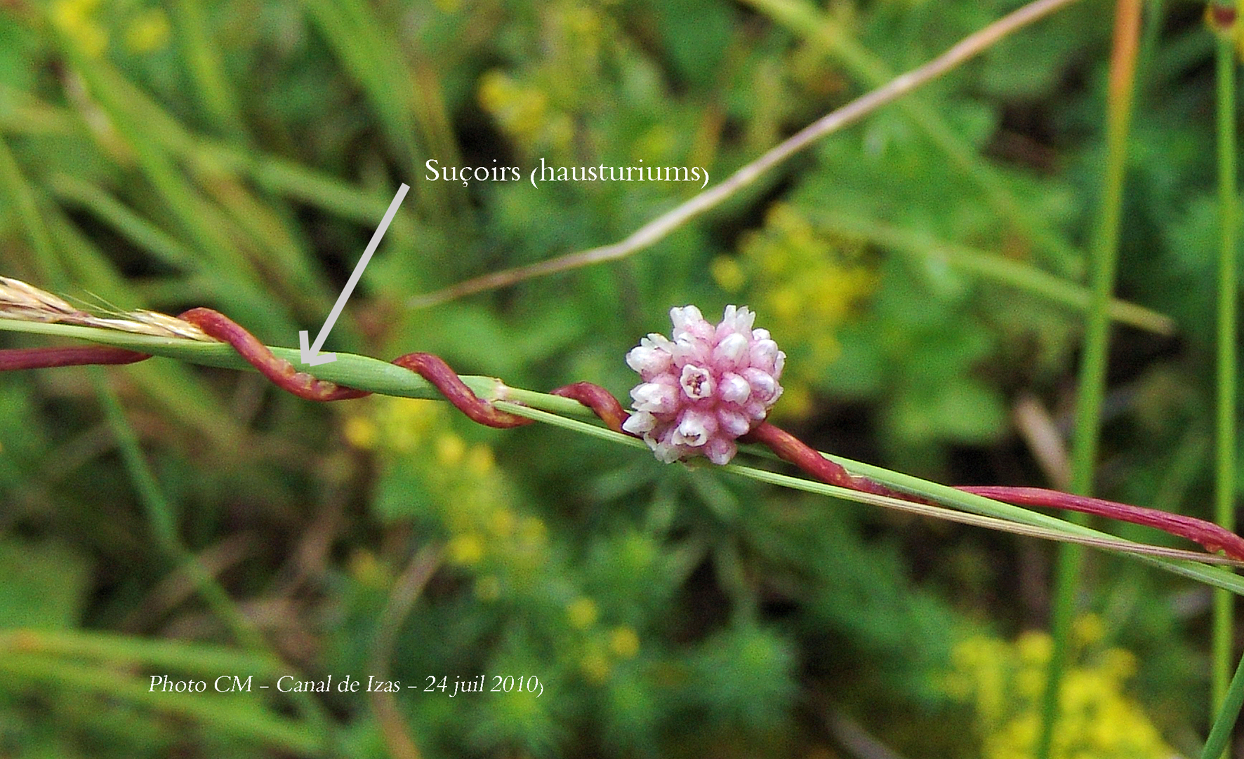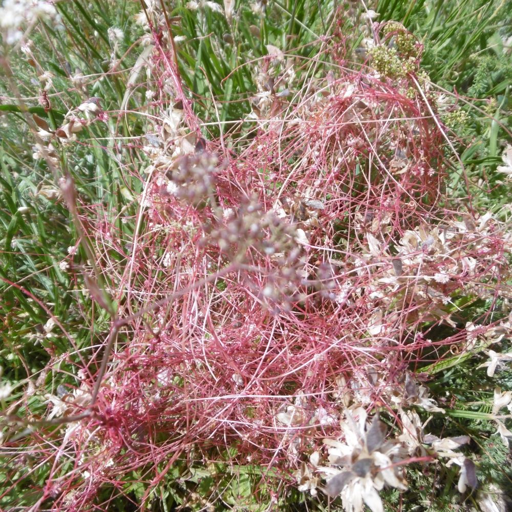 La cuscute est une plante de la famille des Convolvulacées. Elle est holoparasite et se développe aux dépens de plantes hôtes. La photo a été prise dans le Cantal ; elle date de l'année dernière et je ne souviens plus de la plante parasitée.
