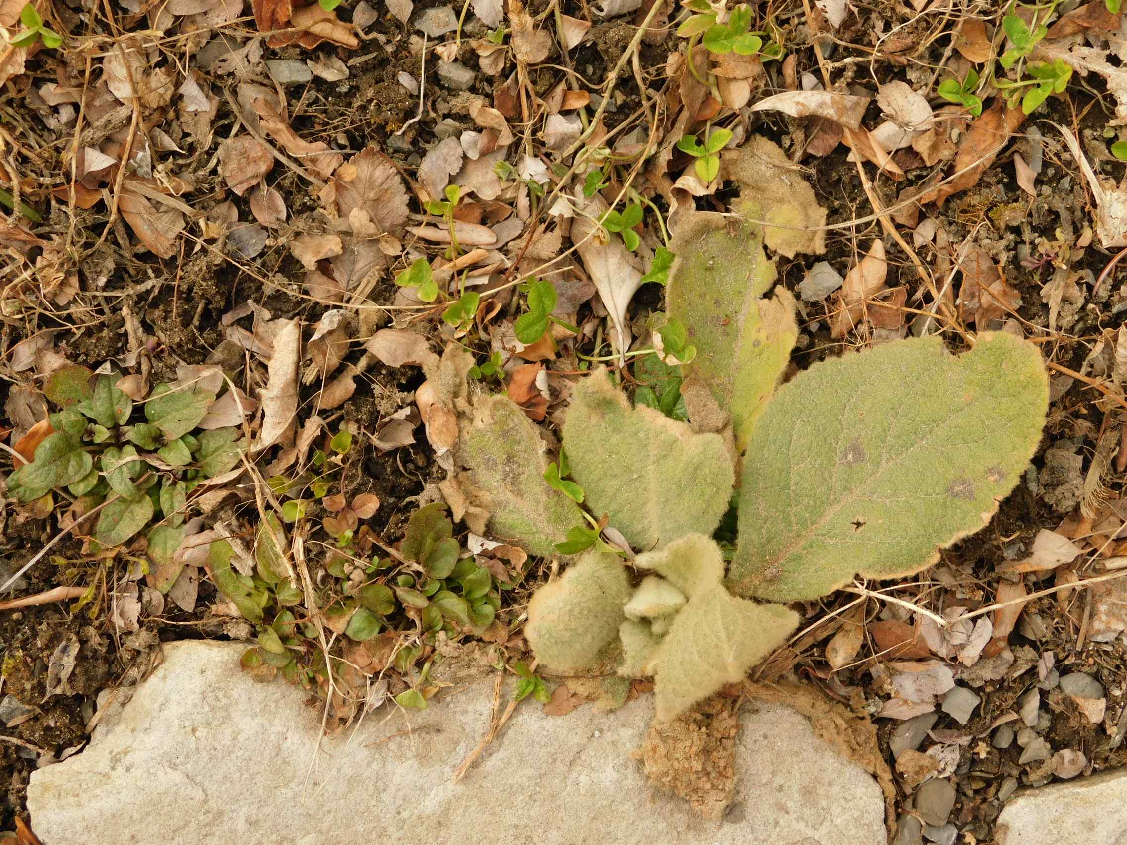 On peut voir une euphorbia polychroma qui a du mal à se développer , car en concurrence avec des violettes et du tamier commun.