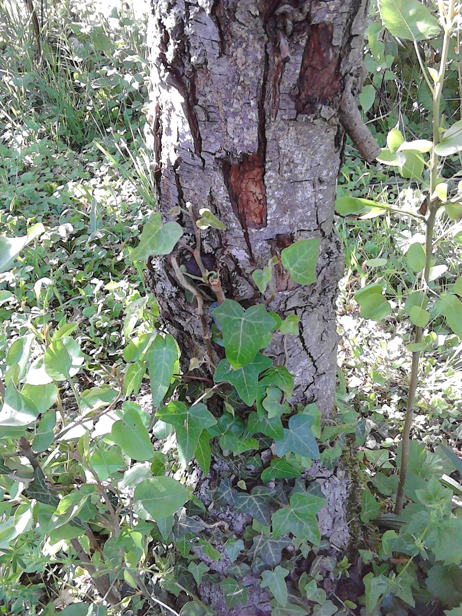 J'ai choisi l'exemple du lierre sur le tronc d'un vieux cerisier sur le bord de notre jardin. Nous avons dû couper ce cerisier en fin d'hiver car à chaque chute de neige ou fort coup de vent, plusieurs branches tombaient chaque fois, sur la chaussée ou les fils électriques/téléphoniques. Nous ne l'avons coupé qu'à mi-hauteur, en espérant qu'il serve de refuge à la faune et la flore environnante.
