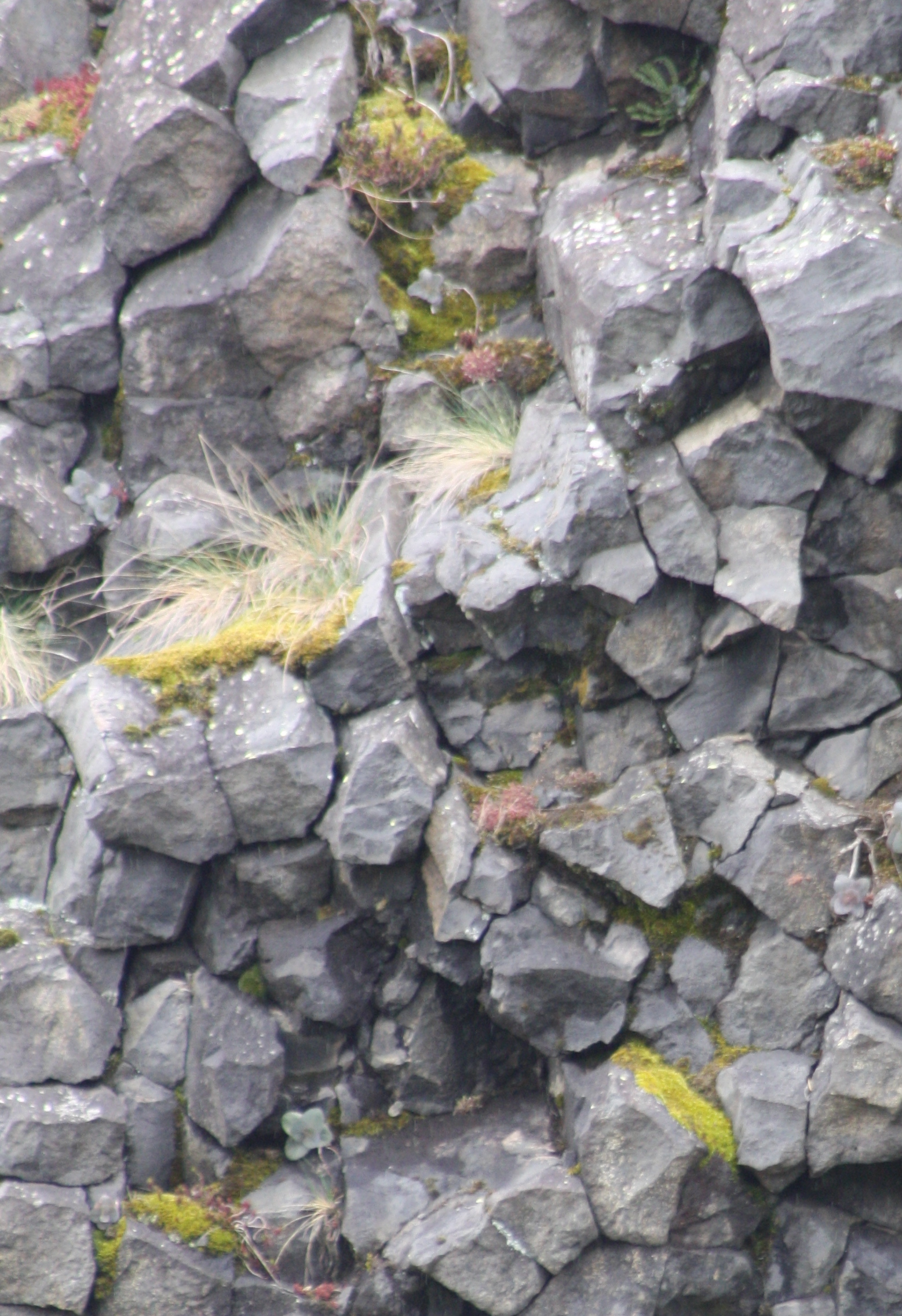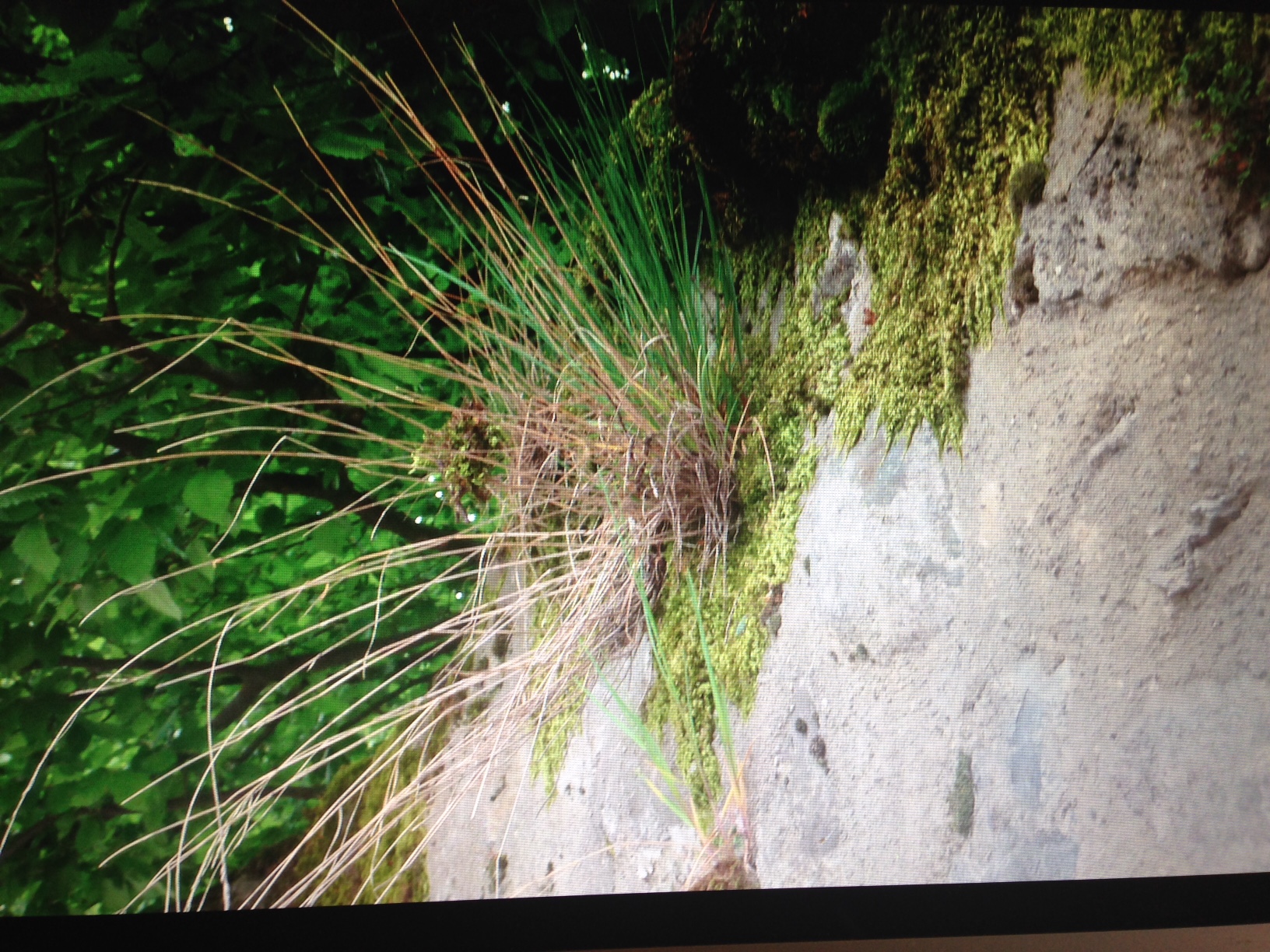 Grâce aux mousses différentes plantes herbacées s'installent sur un vieux mur, pourtant rejointoyé il y a quelques années: un défi à la gravitation; bel exemple de commensalisme.