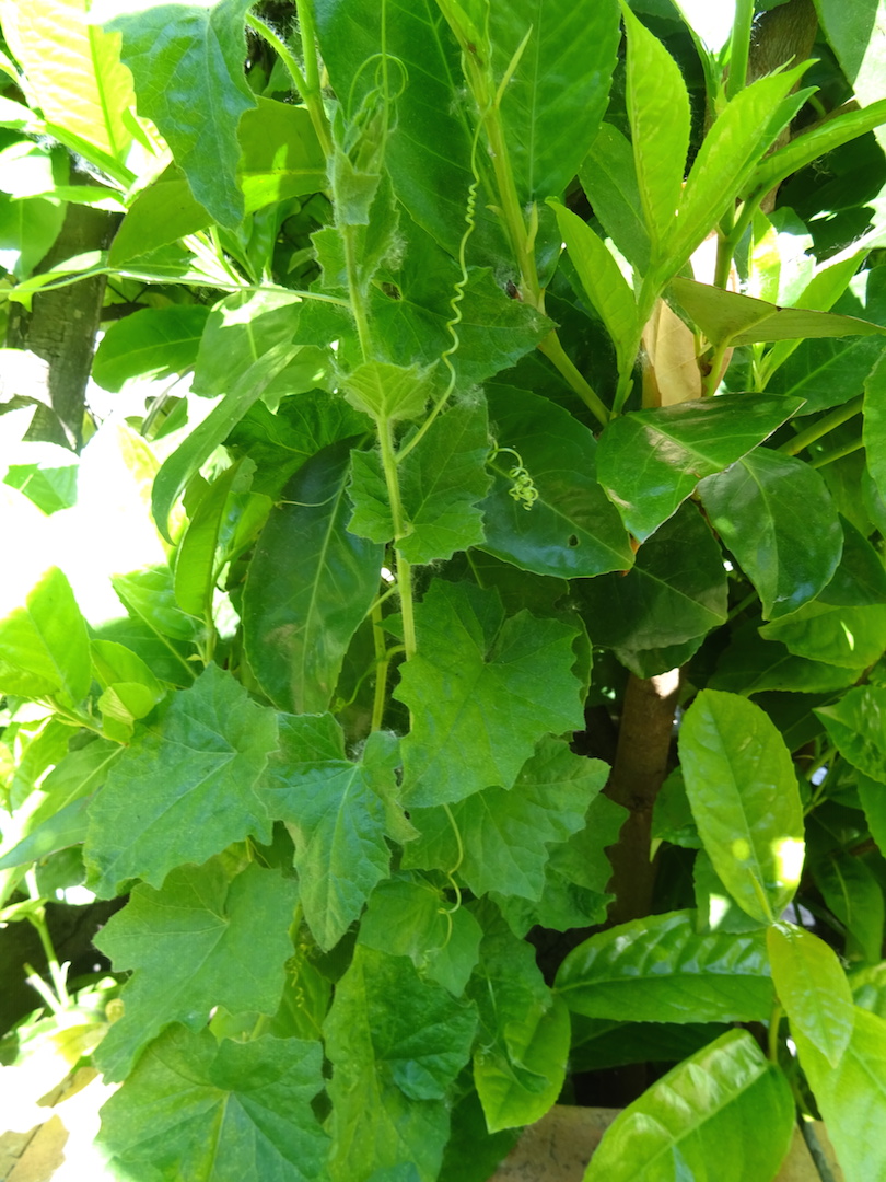 Dans un jardin que je ne peux fréquenter actuellement, j'ai le souvenir d'un jasmin (Jasminum officinale) qui prend appui sur ce qui me semble être un laurier-cerise (Prunus laurocerasus) pour accéder à la lumière. Il s'agit là d'un parasitisme faible.
