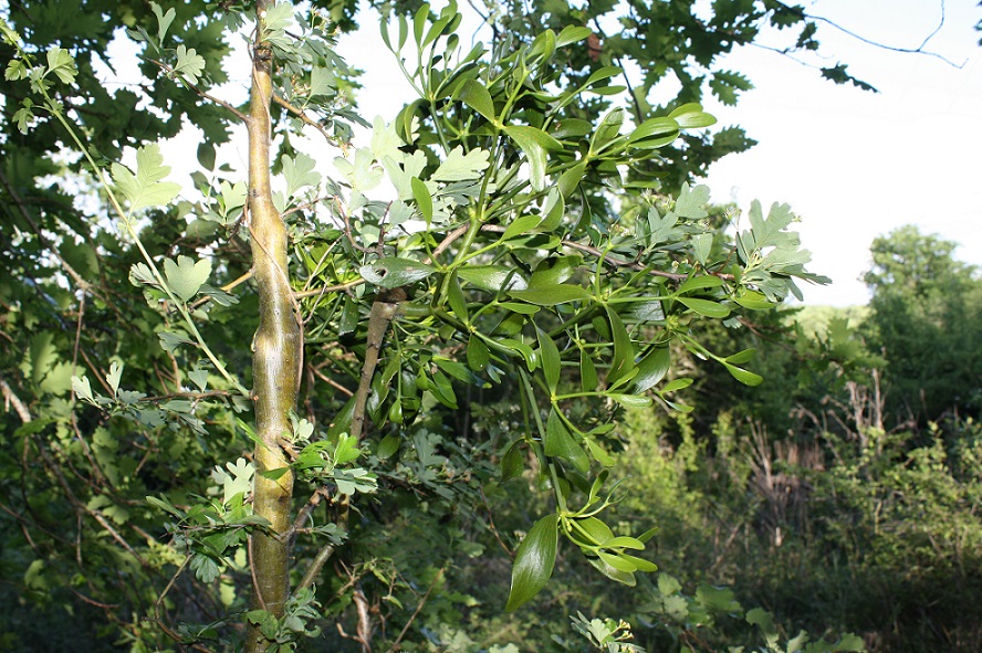 Voici un exemple d'un gui parasitant une aubépine, Crataegus monogyna. On peut voir sur la photo que la parasitisme du gui déforme la courbure du tronc de l'aubépine, en formant des boursouflures. Le gui a bel-et-bien un impact négatif sur l'hôte.