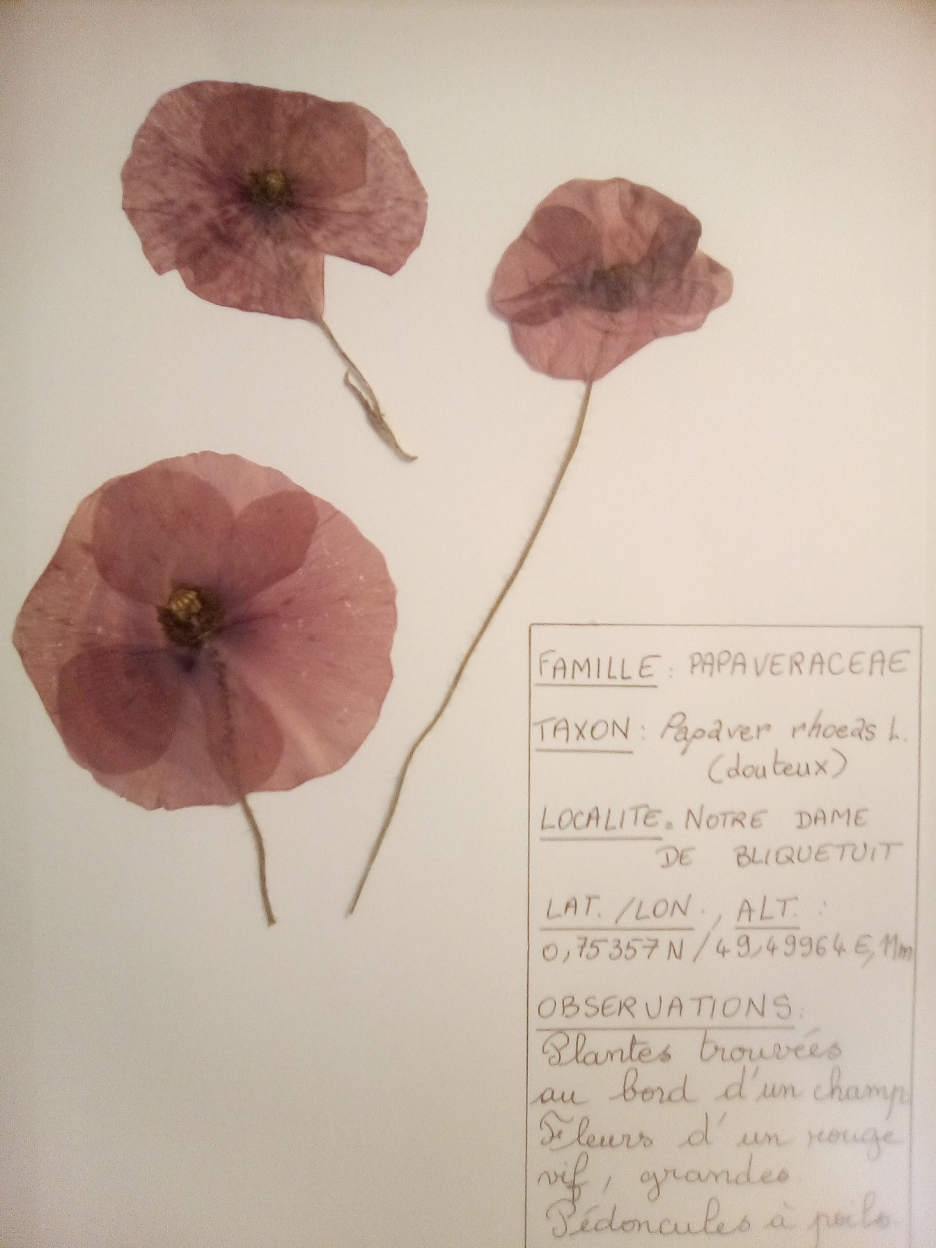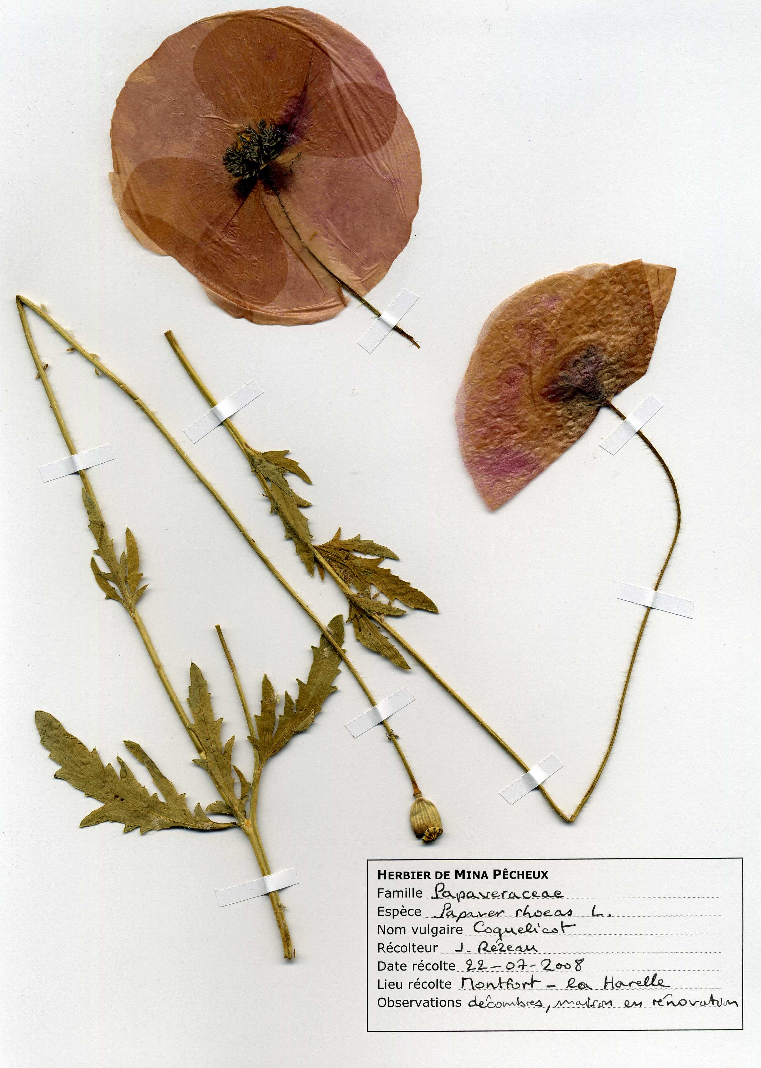 Mon herbier est accompagné d'une version en ligne, où on trouvera des photos prises en principe au moment de la récolte du spécimen. C'est ici : http://www.rezeau.org/wp-flore/papaver-rhoeas-l