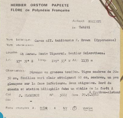 Au final j''ai déchiffré une dizaine d'étiquettes du projet sur la Polynésie française. Sur la plupart figurait le nom de l'île, voire de l'archipel, parfois écrit à la main, parfois à la machine à écrire. Etaient également mentionnés le nom de l'espèce et du ou de la botaniste qui avait créé la part d'herbier.