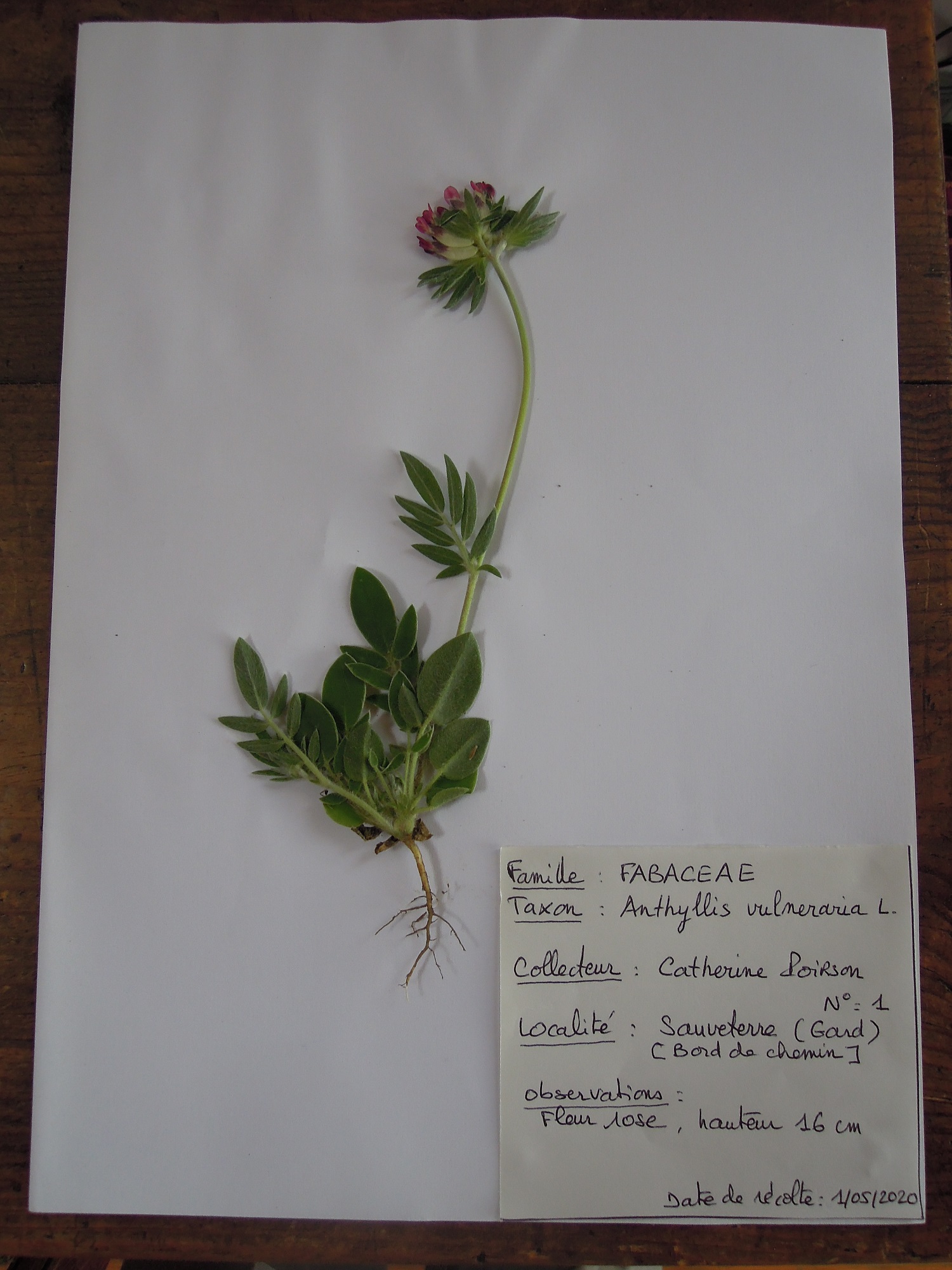 Sur ce spécimen séché il manque malheureusement la partie radiculaire. En revanche on a 2 fleurs (face et profil) et un fruit. On remarquera que la couleur rouge de la corolle est plutôt bien conservée au bout de 12 ans, contrairement à d'autres fleurs.