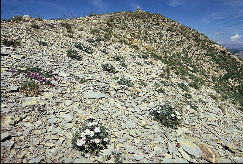 Éboulis marno-calcaire alpin à nival humide et froid à Saxifrage à deux fleurs. Menaces sérieuses plausibles du réchauffement climatique (Belledonne entre autre)