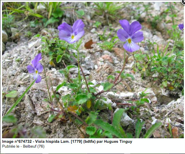 Voici une photo d'une plante en situation critique en Haute Normandie: la Pensée de Rouen (Viola hispida), aussi appelée Violette de Rouen. Elle n'existe plus que sur les éboulis et sous-bois des falaises de la vallée de la Seine, entre Paris et Rouen. Une relation mutualiste a été établie entre les fourmis et la violette de Rouen, dans le cadre de sa dissémination des graines. Elle est joue un rôle dans la modification du contournement routier de la ville de Rouen.