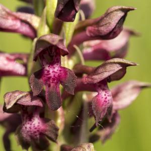 Caractéristiques : Tige droite, ronde, cannelée sous l'épi, vert pâle. Feuilles basilaires lancéolées, caulinaires engainantes, supérieures bractéiformes. Inflorescence en épi dense, oblong-cylindrique. Fleurs pourpre foncé à vert olive, odeur de punaise. Sépales et tépales soudés en un casque pointu. Labelle trilobé, rabattu vers l'arrière, rouge à pourpre, voire verdâtre. Eperon épais et conique, courbé vers le bas, dépassant la moitié de l'ovaire. Bractées plus longues que l'ovaire, étroites, membraneuses.
