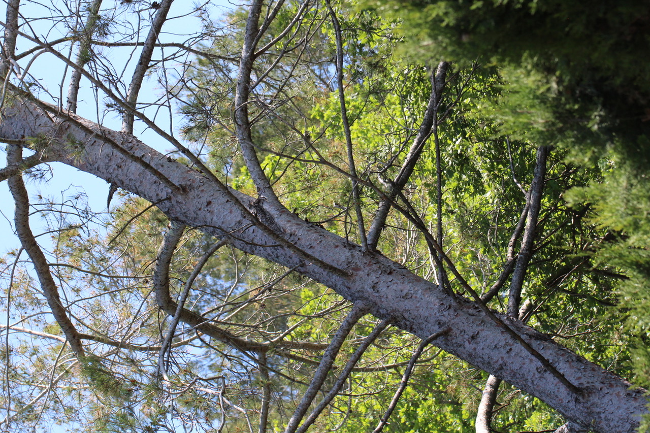 Un pin sylvestre pousse sur mon terrain ; Son écorce est rouge-orange, écailleuse et lisse ce qui en fait un arbre dans lequel il n'est pas très agréable de grimper !